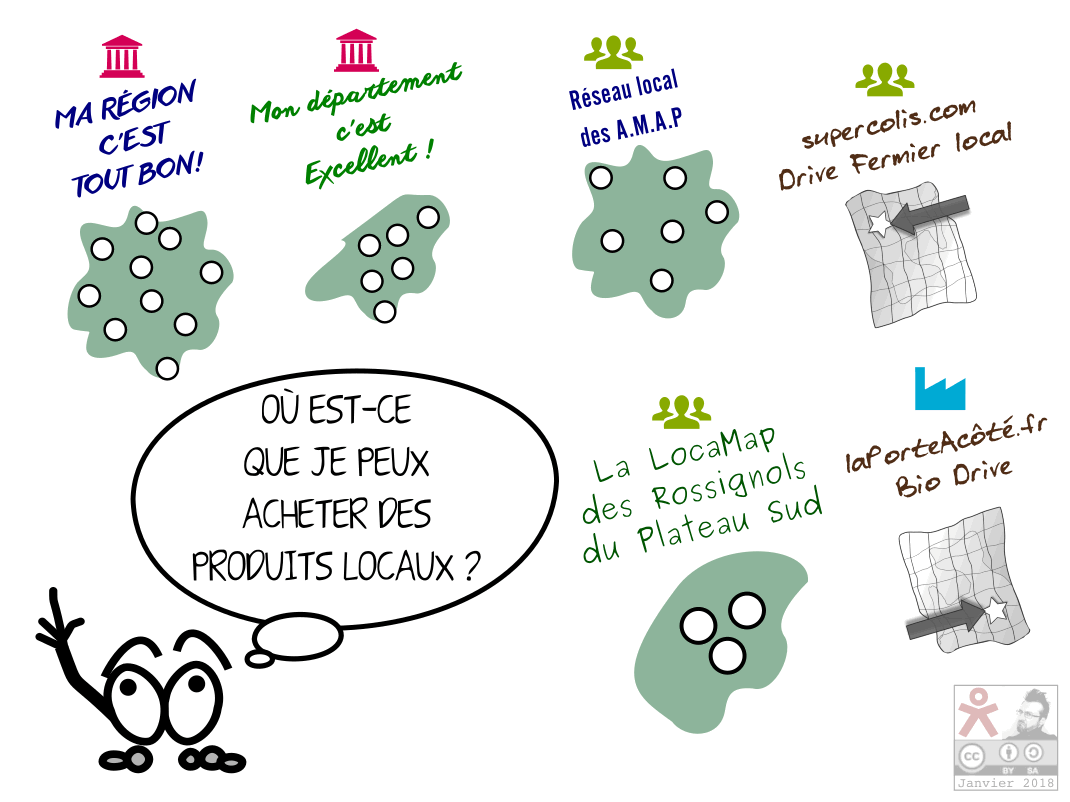 Partons d’un contre-exemple, un cas assez courant, ici sur un territoire fictif pour ne stigmatiser personne. Un citoyen lambda, « consommacteur » soucieux de s’alimenter en produits locaux, se demande où il pourrait se les procurer. Plusieurs organismes ont tenté de répondre à cette question. Mais chacun l’a fait de son côté, en fonction de critères qui lui étaient propres.