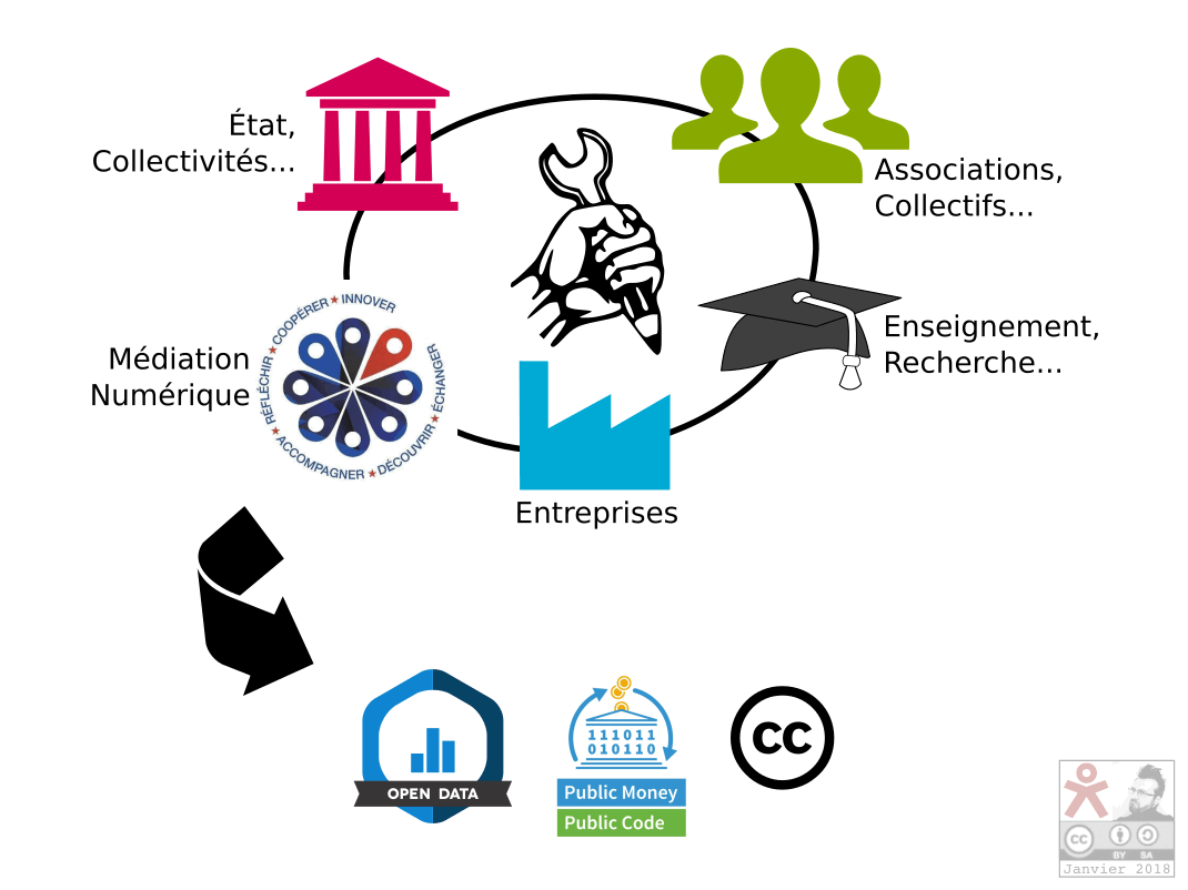 [Vous noterez (en bas à droite) que les diapositives de cette présentation, sont sous Licence Creative Commons, tout comme l’est cet article. La raison, outre la motivation militante et l’ego de son rédacteur, en est simple: elle a été produite sur un temps de travail, financé par une convention avec un organisme public. Le travail a été fait, le salaire versé. Si d’autres veulent la réutiliser, qu’ils se servent librement (en respectant la licence). Quand bien même on la réutiliserait, on ne va refacturer ni ce temps de travail, ni l’utilisation de ce support. On est une association d’éducation populaire, pas une firme de consultants ou une « start-up sociale » fondée par des diplômés d’une grande école de commerce.]Bref…
