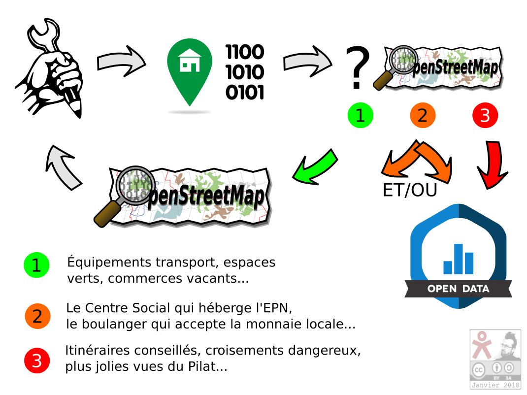 Le travail effectué sur la Carte de la médiation numérique dans la Loire, ou même la géolocalisation des lieux d’événements sur l’agenda de la MedNum42, conduit en général à saisir une partie des données dans la base OSM si elles n’y figurent pas déjà.