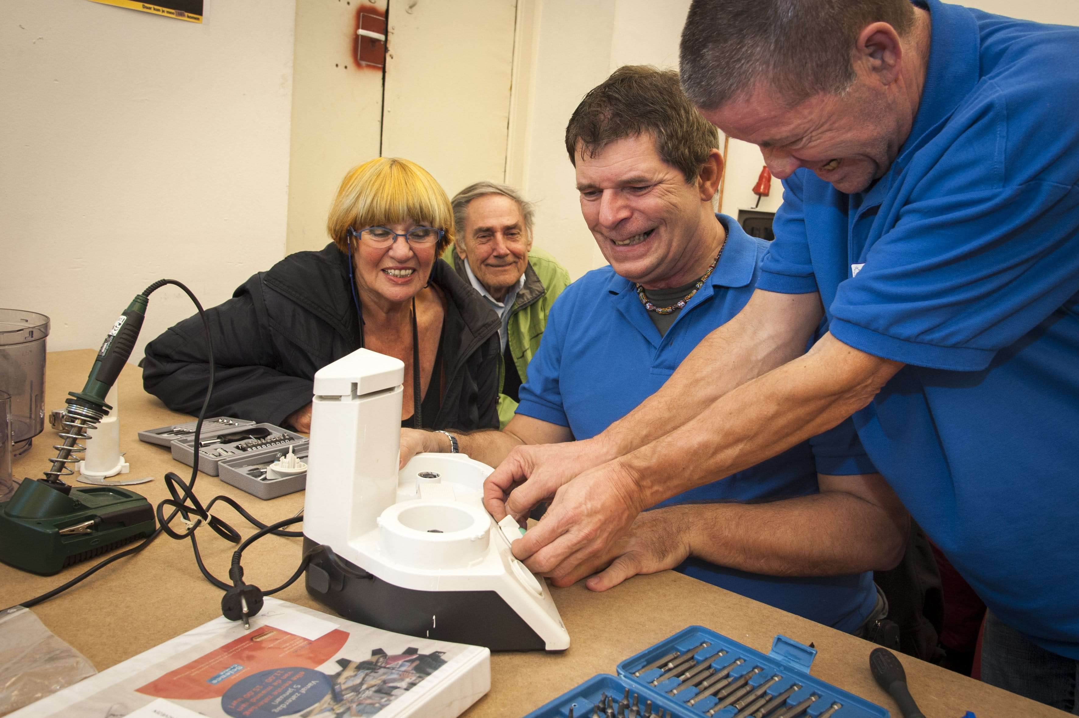 Une vingtaine de “cafés de réparation” sont pleinement opérationnels depuis deux ans aux Pays-Bas et plus de 50 en cours de planification où des bénévoles donnent une nouvelle vie aux appareils en panne. Le Repair café est une initiative de Martine Postma, née du studio de réparation organisé dans le cadre du projet « Plateforme21=Repairing », au printemps 2009 à Amsterdam.