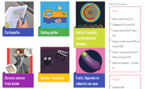 Les fiches d’animations sont mises en page avec un formulaire unique. Cela permet de voir très rapidement à quel(s) public(s) s’adresse l’animation, ainsi que sa durée et son « type » (jeux vidéo, fablab, usages des jeunes,…). Un système de filtres permet de trier les animations pour ne voir que celles qui correspondent aux critèrès sélectionnés.
