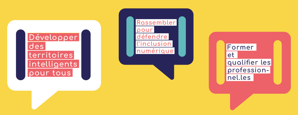Nous mobilisons les acteurs, accompagnons l’émergence de projets et nous développons la formation comme la distribution de ressources. Cette triple mission vise à être pérennisée pour qualifier les acteurs et interpeller les collectivités territoriales en soutenant localement des réseaux opérationnels pour répondre aux enjeux de dématérialisation par un numérique inclusif.