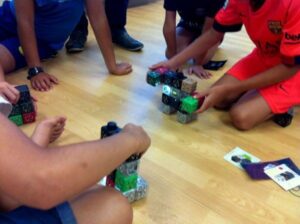 Les animateurs ont ensuite présenté les différents Cubelets et leur fonctionnement avant de les répartir entre les jeunes qui ont formé des groupes spontanément afin d’avoir plus de possibilités de construction. Ces derniers ont ensuite commencé à réaliser des robots, petits au départ, puis de plus en plus grands. Ils ont également échangé des pièces afin de varier leurs constructions.