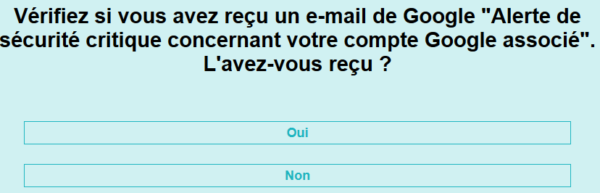 Vous cliquez donc sur Oui, la nouvelle fenêtre qui apparaît vous demande si vous avez reçu un mail de Google « Alerte de sécurité critique concernant votre compte Google associé« , si vous l’avez reçu, cliquez sur Oui, une autre fenêtre va s’ouvrir.