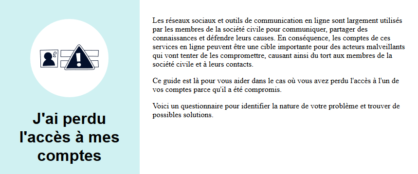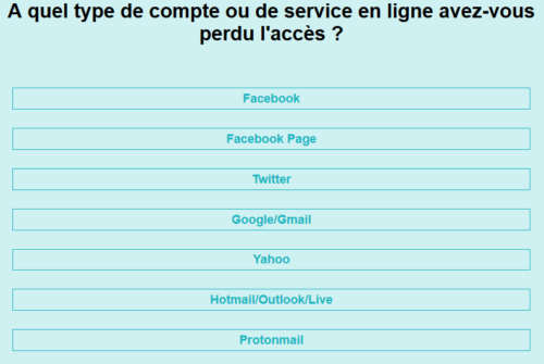 Sur la page d’accueil vous cliquez donc sur : « j’ai perdu l’accès à mes comptes« , une nouvelle page s’affiche qui vous propose une brève explication sur l’accès aux comptes et vous propose un questionnaire.