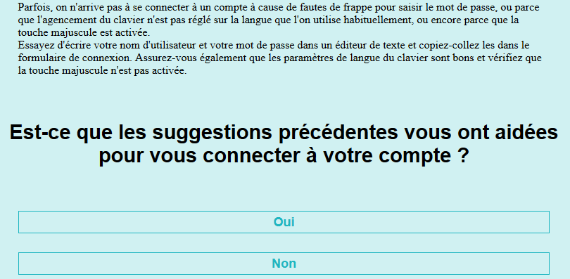 Si le problème est résolu et que votre mot de passe fonctionne: superbe, pour vous l’expérience s’arrête ici (en tout cas pour cette fois), et vous pouvez cliquer sur Oui à la question « Est-ce que les suggestions précédentes vous ont aidées pour vous connecter à votre compte « .