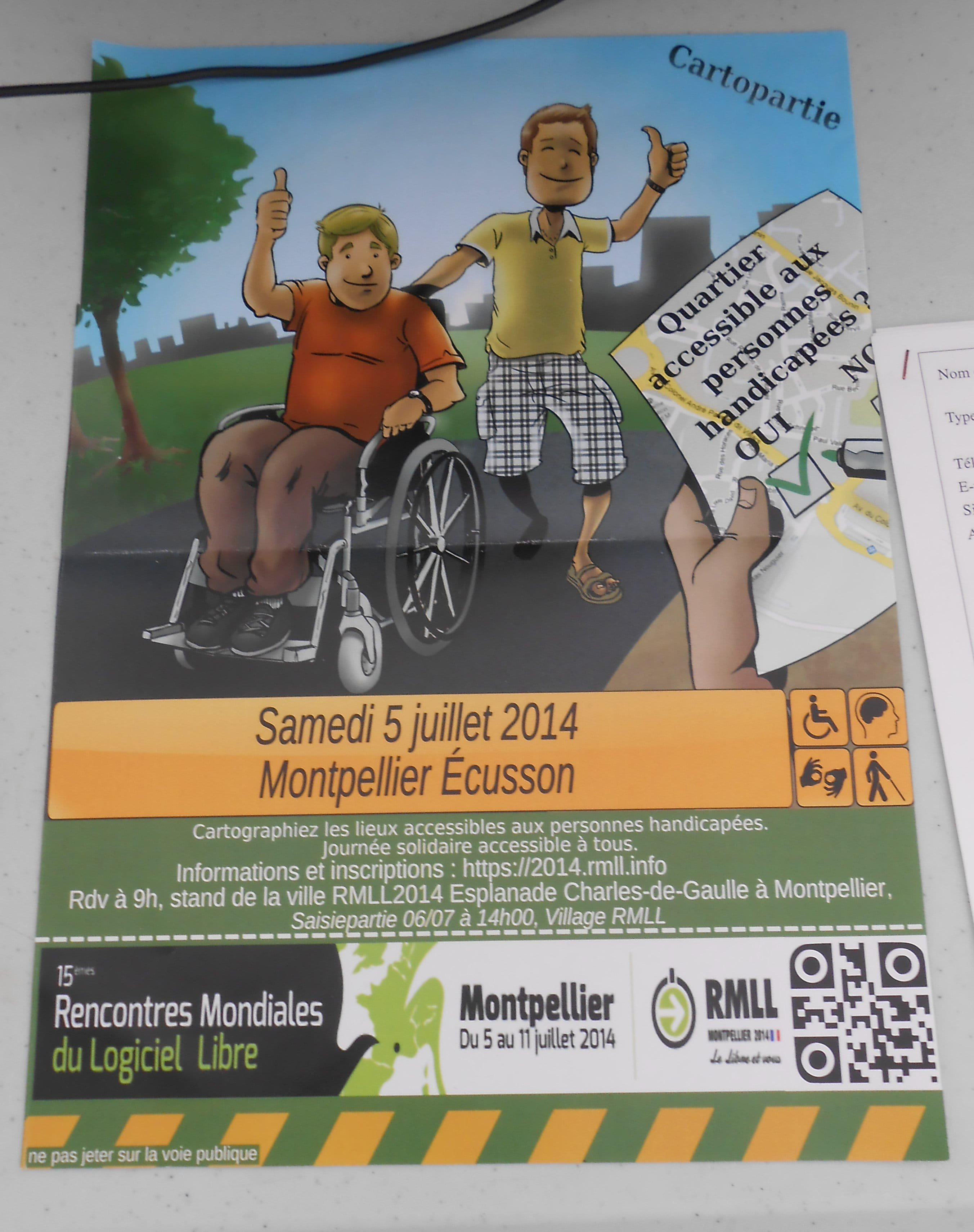 Sac au dos et les a priori de coté, me voici arrivée à l’Université de Montpellier, l’entrée y est totalement libre et gratuite, dans le village une vingtaine de bénévoles s’affairent. Cette année, il y a eu quelques couacs au niveau de l’organisation, me dit-on, mais qu’à cela ne tienne : pas moins de 300 conférences et ateliers sont proposés sur 6 jours. Au village des exposants, j’ai retrouvé des amis de Emmabuntus (Emmaus et logiciel libres font très bon ménage !) ainsi qu’un magnifique serveur nomade Jerry. L’équipe d’OpenStreetmap et le projet wheelchair.org pour la mobilité, ainsi que les fidèles représentants de Framasoft, Ubuntu, Mozilla, Linux et son DoudouLinux pour les plus petits, entre autres. Ou encore des associations locales, leBib Hackerspace local en recherche d’un nouvel espace, TechLabLR en pleine démonstration de construction de RepRap. Sans oublier, l’association NosOignons.net qui oeuvre pour l’amélioration de la qualité du réseau Tor avec son routage en oignon. Et oui, j’ai craqué pour l’affiche qui trouvera sa place dans notre hackerspace stéphanois Openfactory42 !