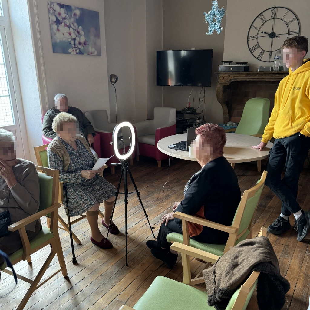 - Des activités liées à un projet à long terme impliquant l’ensemble des résidents, de près ou de loin : création d’un journal télévisé mensuel en interne présentant les membres du personnel de l’EHPAD, les activités programmées ce mois au sein de l’établissement, les menus de la “cantine”, les anniversaires, etc…